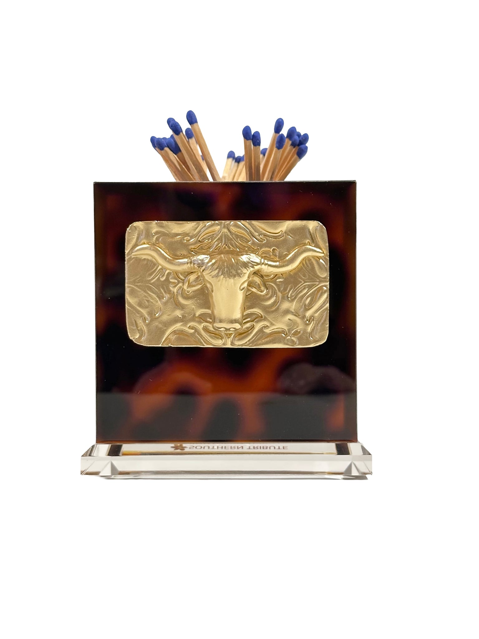 Add a touch of charm to your decor with our exquisite fine acrylic match striker. This stunning lucite-based acrylic match striker is not just sparkly but also durable and weighty, making it a must-have addition to your fine tabletop and tabletop decor. Our favorite collection, this match striker comes with 3-inch blue tipped matches, ready to light up your space in style. Choose from seven elegant colors and over 50 gold hand sculpted icons, including tortoise, lapis blue, pearl, gray, onyx, emerald, and raspberry, to perfectly complement your existing decor. dimensions of 4 x 4 x 4.5, this match striker is both practical and stylish, making it a perfect gift for your loved ones or a treat for yourself. Order yours now and add a touch of sophistication to your home decor.