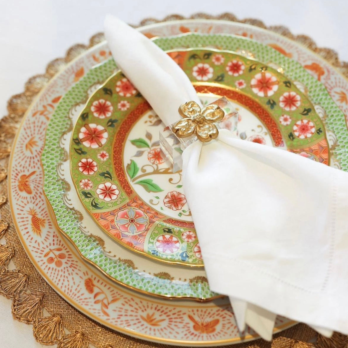 Decorative plate with floral pattern and white napkin on a gold doily